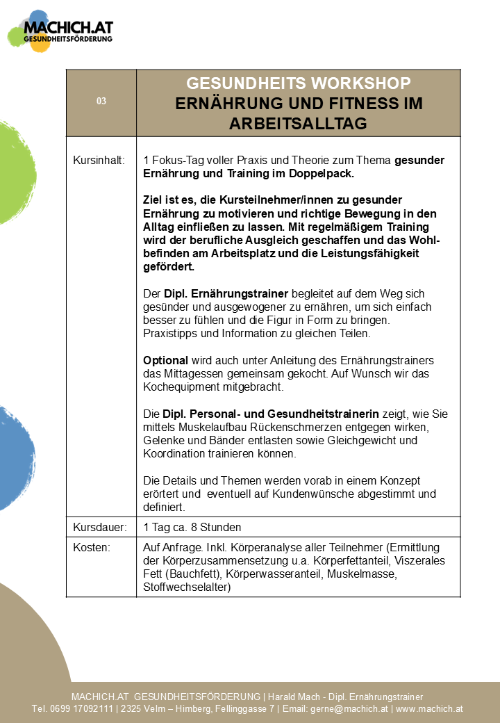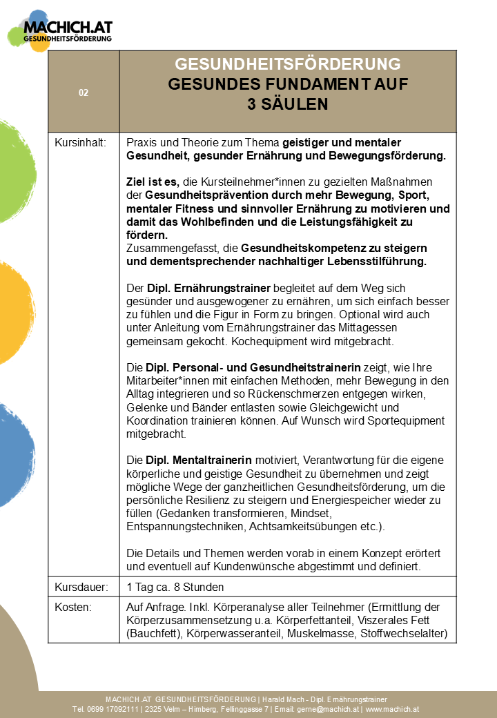 Ziel ist es, die Kursteilnehmer:innen im Bereich Gesundheit, Vitalität und Motivation im Zusammenhang mit Sport und vernünftiger Ernährung zu stärken.