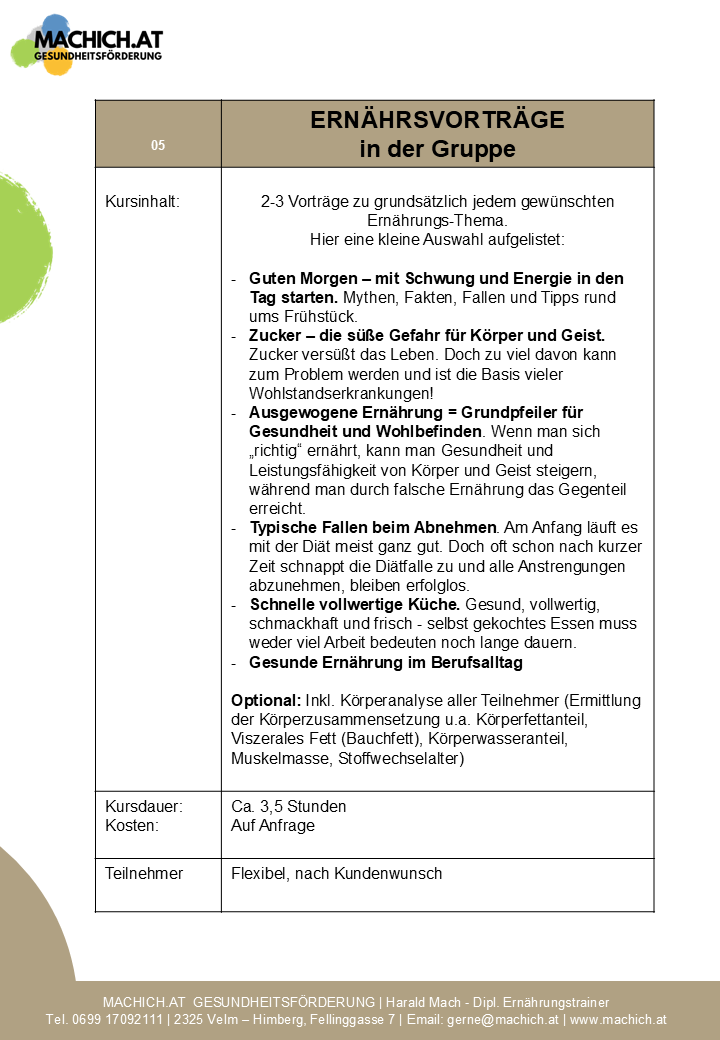 Fachvorträge zu grundsätzlich jedem gewünschten Ernährungs-Thema.